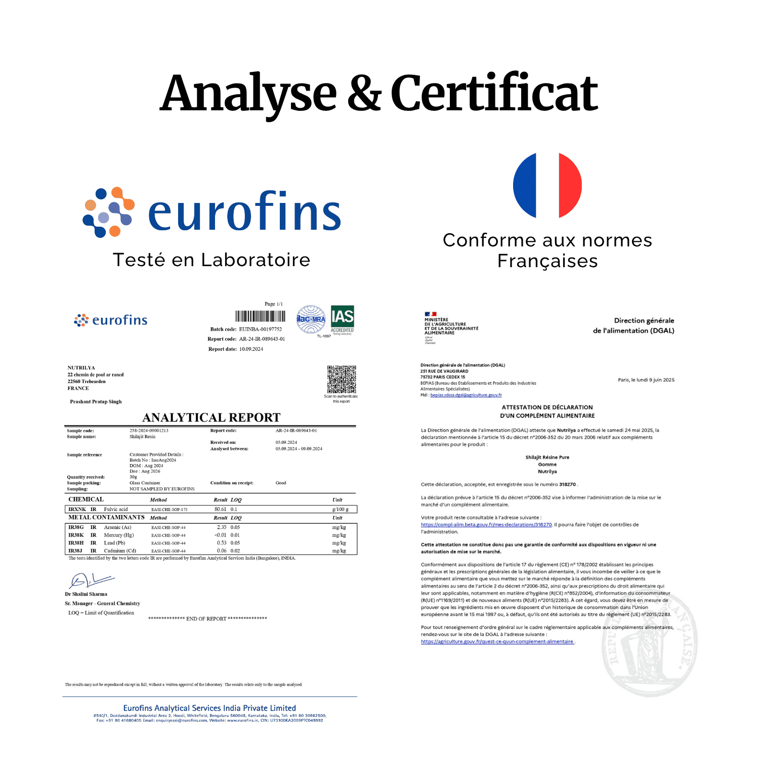 Chez Nutrilya, la pureté et la sécurité de notre Shilajit sont notre priorité. Chaque lot est analysé dans des laboratoires indépendants en France pour garantir une qualité optimale, conforme aux normes françaises et européennes.