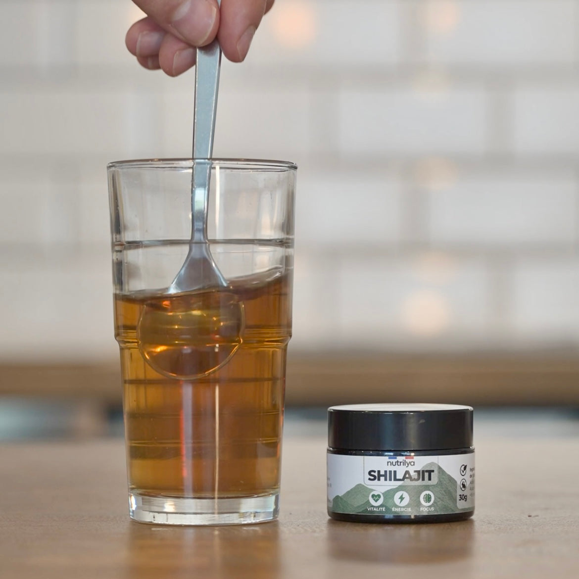 Mélangez votre Shilajit dans un verre d’eau tiède, de thé ou de lait végétal jusqu’à dissolution complète.